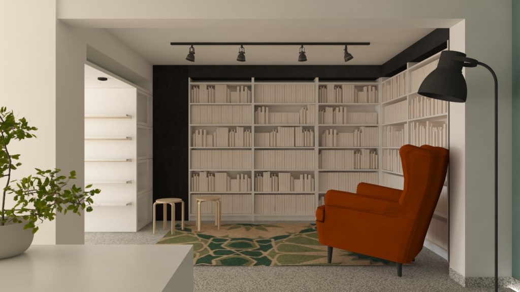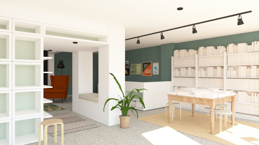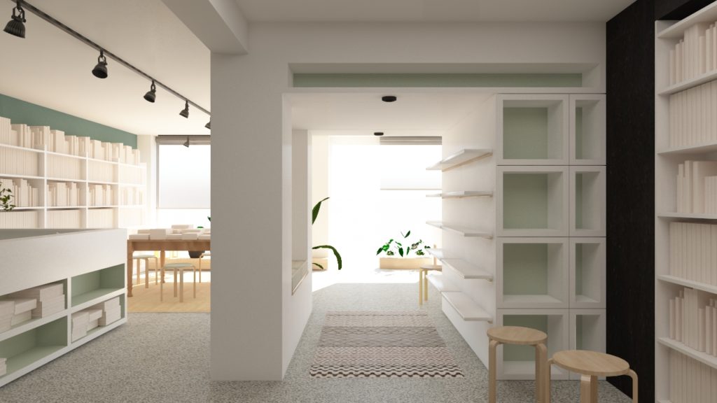 Inside, a plasterboard shelving system was crafted to embrace and unify the existing structural elements, including the metal stair, columns, and beams. Its simple square geometry gives the store a clean, minimal aesthetic. Existing bookcases were painted white, while carefully chosen furnishings add to the homey feel: a wing armchair, a vintage rug, an old dining table stacked with books, and retro schoolbook covers displayed on a gallery wall behind the counter. Soft whites and pastel greens, contrasted with a blackboard wall, complete the aesthetic, complemented by a hand-drawn illustration defining the store’s identity.
