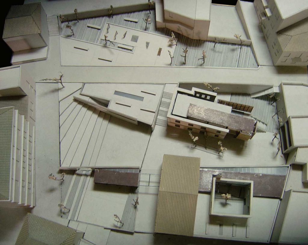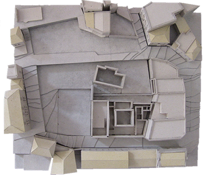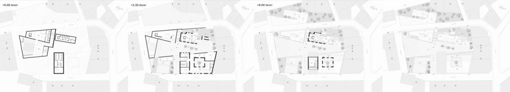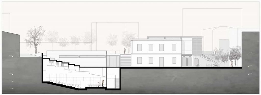 Since a musical venue requires a larger volume than the site can offer, an excavated structure is introduced, making use of the steep incline of the terrain while respecting the small-scale character of the area. Its roof, aligned with the street level above, provides unobstructed views over the site. Wide, amphitheatrical seating tiers connect the surroundings to the central space, giving visitors clear views of the performances below.